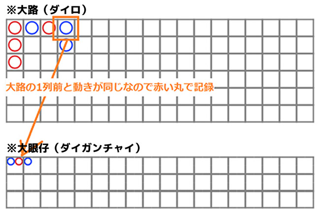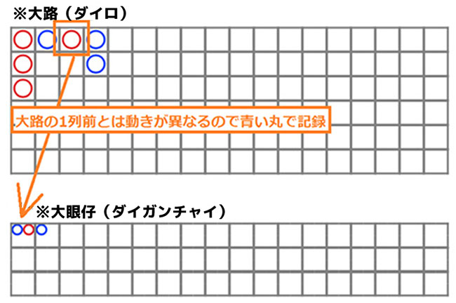 大眼仔(ダイガンチャイ)では、大路(ダイロ)の最新の結果が1列前と同じ動きだった場合に赤い〇を、違う動きだった場合に青い〇をつけます。