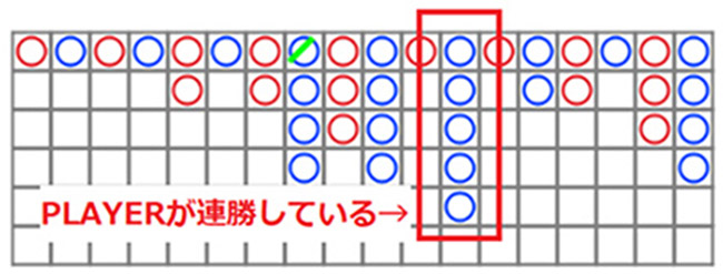 上記のようにBANKERとPLAYERの勝利が交互に起こっている状態では、前回と逆の結果になる可能性が高くなります。前回は青い〇(PLAYERの勝利)となっているので、今回はBANKERにベットすべきと判断しましょう。