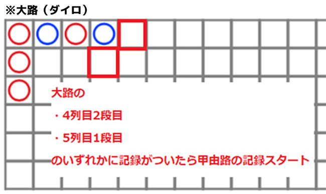 甲由路(カッチャロ)は、大路(ダイロ)の最新の結果が3列前と同じ場合には赤い〇(または斜線)を、違う場合には青い〇(または斜線)を記録します。