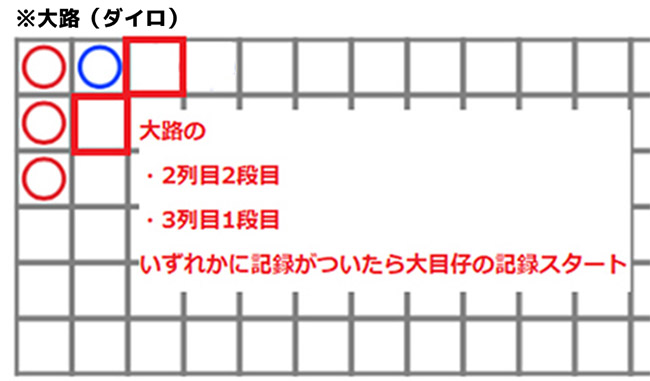 バカラの結果そのものではなく、連続性や偏りの傾向を読みたい時に使える罫線です。大眼仔(ダイガンチャイ)の記録は、大路(ダイロ)の2列目の2段目もしくは3列目の1段目が記録された時にスタートします。