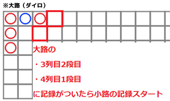 小路(シュウロ)は、大路(ダイロ)の最新の結果が2列前と同じであれば赤い〇を、違う結果であれば青い〇を記録します。