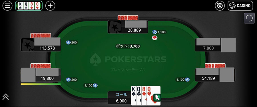 テーブルに最初の3枚のコミュニティカードが公開されると、次のベットラウンドが始まります。このラウンドでもプレイヤーはチェック、ベット、レイズ、フォールドを選択できます。