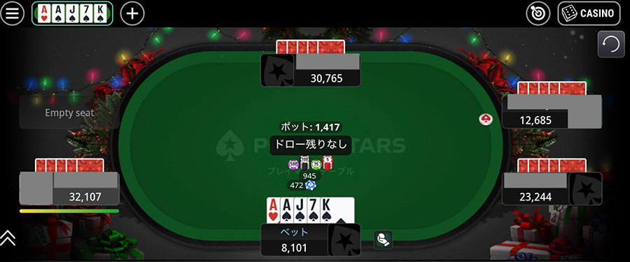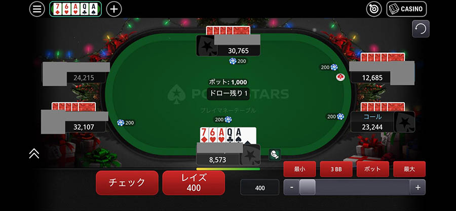 ドローが終わると、2回目のベッティングラウンドが開始されます。強い役ができていればレイズしたり、全く勝ち目がなさそうならフォールドしたり、ドロー後の自分の手札を見てアクションします。