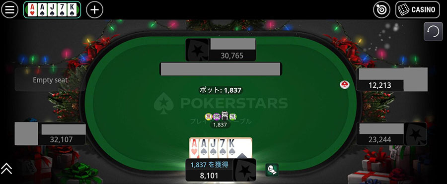 キャッシュゲームでは、ゲーム中に獲得したチップがそのまま利益となります。勝ったポットの金額がそのまま自分の利益になるため、短時間で利益を出すことも可能です。